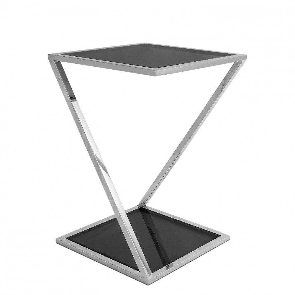Supporto a colonna per vasi o sculture, in acciaio inox lucido dal disegno geometrico e con due piani di appoggio quadrati in vetro temperato fumè